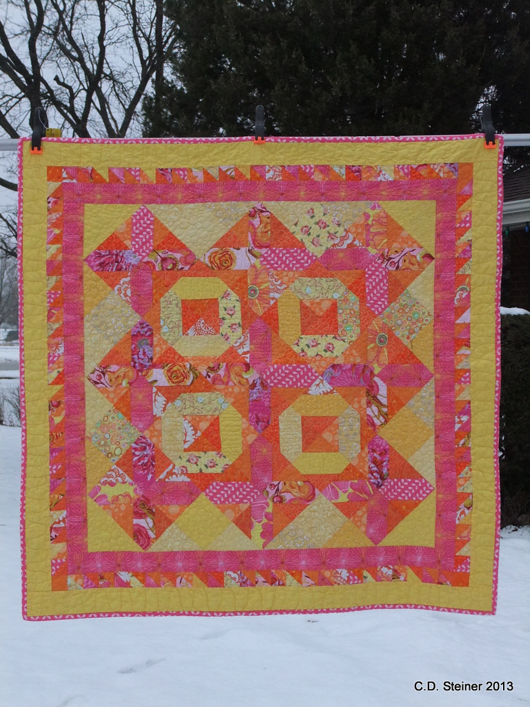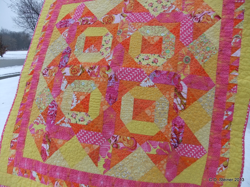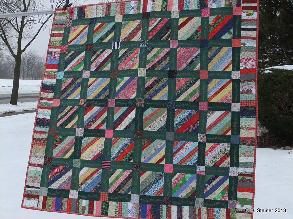 I spent an hour this morning setting up my background support to photograph both the Feather Practice String Quilt and Mmmwhaah!, the X’s and O’s quilt that will be given to our new niece this Christmas!