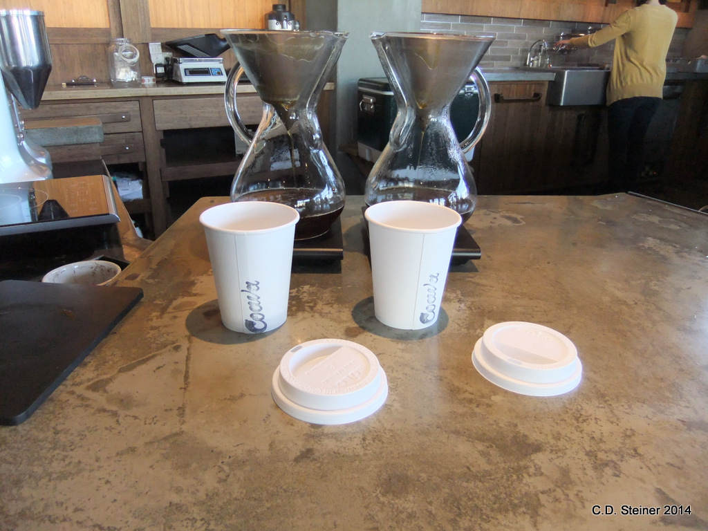 I’ve been told that Portland has a fairly unique coffee scene. My first clue was the first coffee shop, first order. Our coffee was brewed in these glass carafe looking pitchers. I have something like this for our trailer, but plastic, and would NEVER have believed I’d be paying $6.00 for someone to fill the cone with grounds and pour hot water over them.