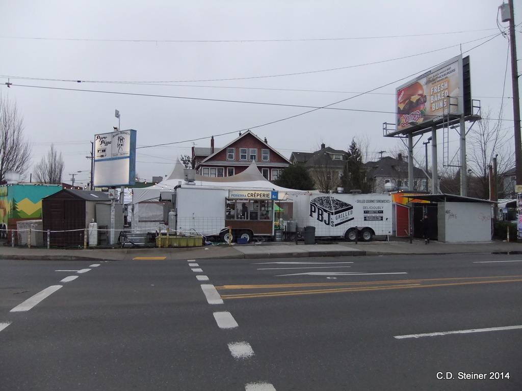 A quirk in the local ordinance allows the food trucks to ‘rent’ a parking space…so as long as the food truck has wheels and can ‘technically’ move they can for all intents and purposes stay put! Puts a whole new meaning on trailer park.