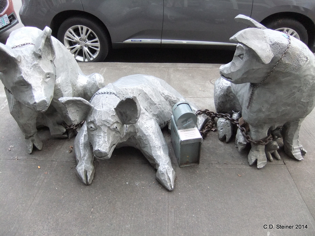 I’d be saying it mildly if I were to tell you there’s a lot of homeless in Portland. The homeless of Portland are heard about throughout the U.S. (believe it or not). I was taking pictures of these three pigs (art) one afternoon…