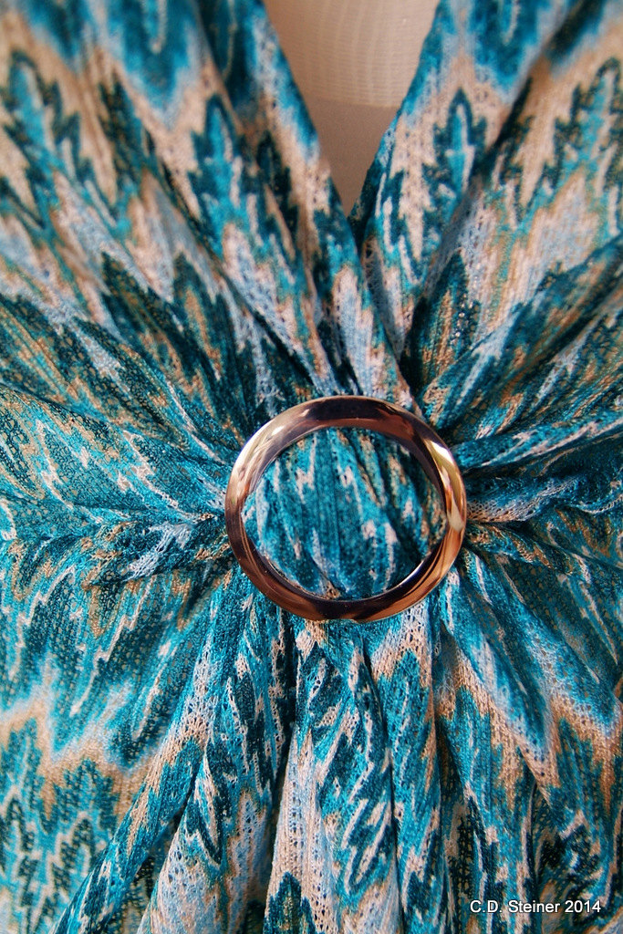 The fabric is a knit from Hancock Fabrics and the colors are perfect. A beautiful Caribbean blue with greens and beige. Very light and it fits perfect.