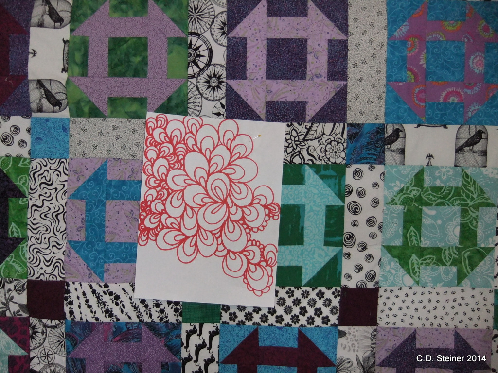 Right now, I can see that this might be too ‘tight’. This quilt has a lot going on and my thought was to quilt it with a free motion pattern that will not compete with all that color going on. I’ll need to enlarge the pattern and work out some long sweeping curves before I begin!