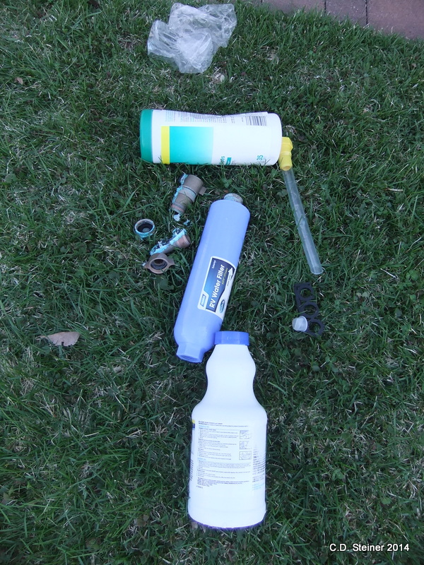 Then if that wasn’t the thrill of the day when I went to add water to the tank my fill spout went right INTO the tank!!! A picture of that fill spout is to the right of the water filter and butting up again the sani-wipes (the clear tube on the yellow piece)…ya…see that there?
