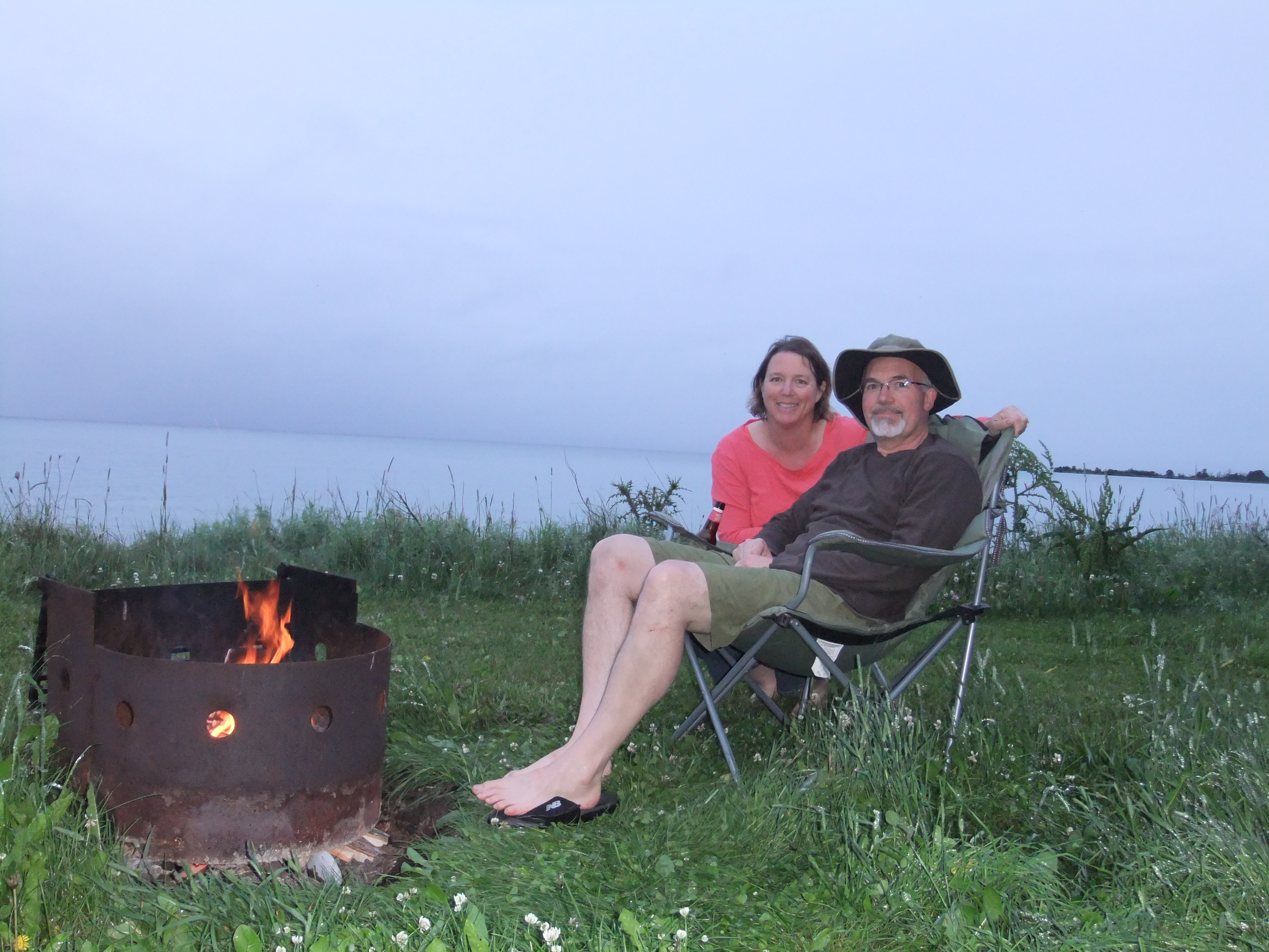 It did rain so we had to deal with wet grass and tables and such but the skies cleared up to a haze for dinner and we sat out by the fire and watched the shorebirds…
