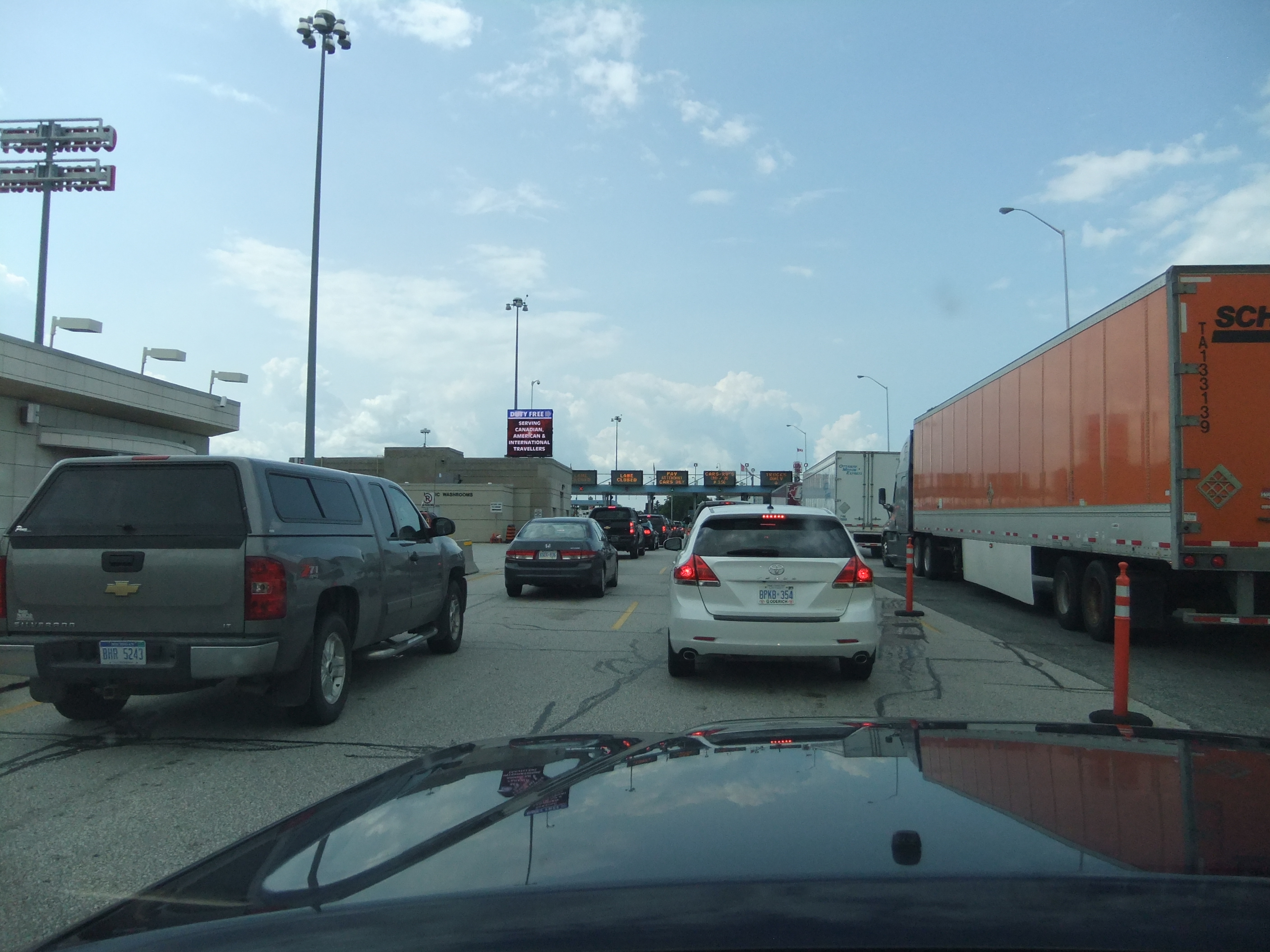 Garmin routed us to the Sarnia crossing. We waited and waited. Only one lane was used for RV’s…and I can’t even tell you what I thought of the cars that kept rushing the lanes and budging their way into our lane!!! In Chicago people get shot for some of those moves. I kept calm and kept checking my phone to see if I was back on-line and waited. I figured we get there eventually…