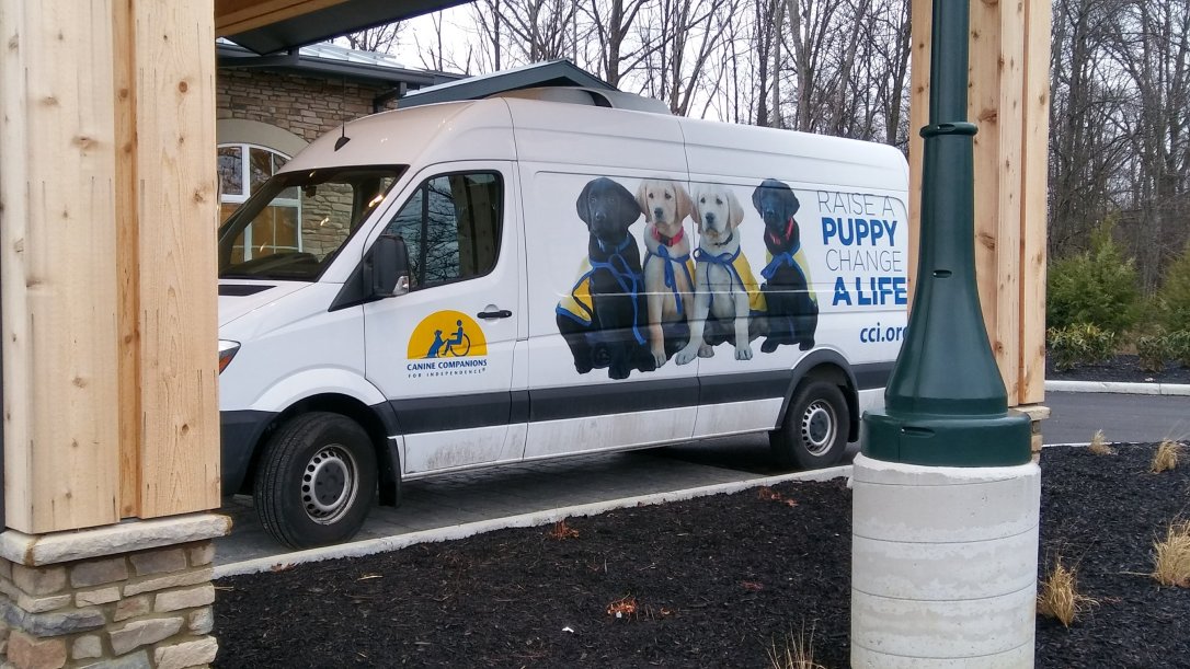This was the scene outside the event facility on Team Graduation day for the North Central Region of Canine Companions for Independence. The billboard van was parked out front and puppy raisers that did not want to drive to the kennels could drop off their pups after the event.
