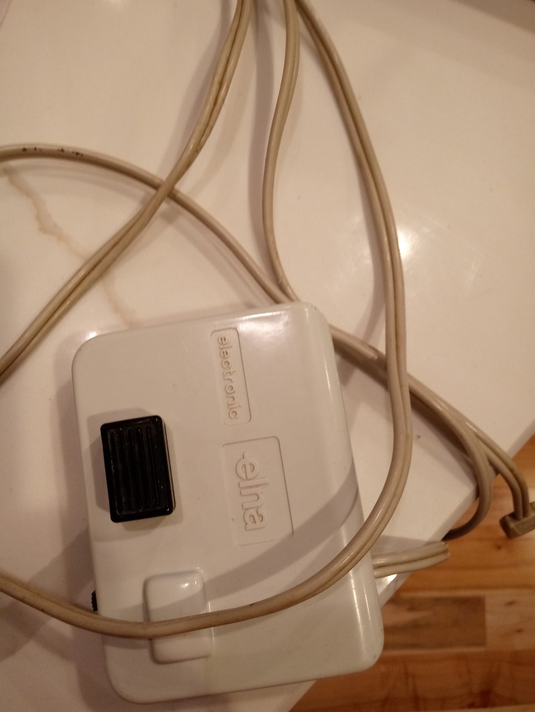 Yesterday on my way to work I passed by a pile of stuff put out for trash collection. On top of an old chair was this machine.